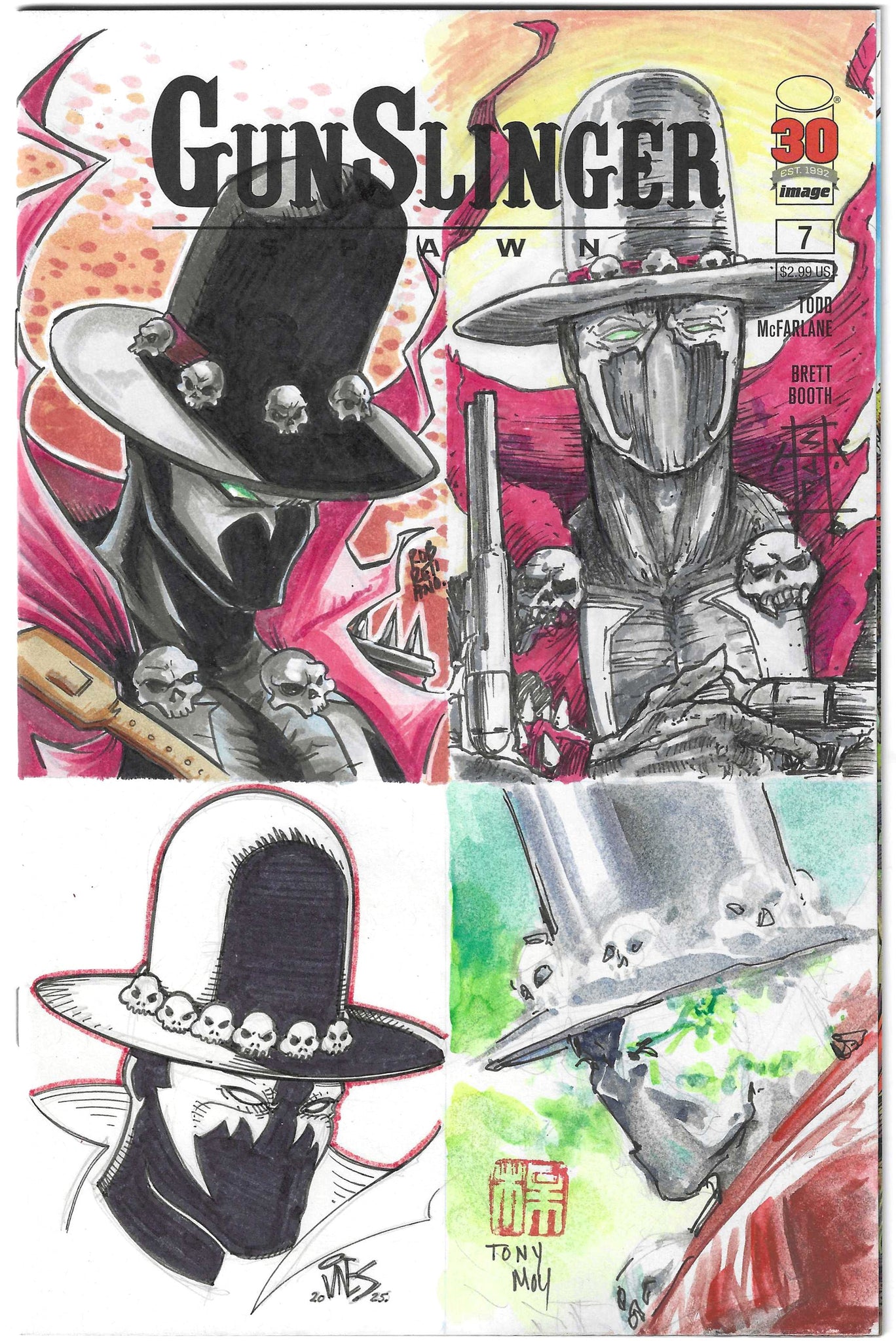 An extraordinary 4-artist sketch jam on Gunslinger Spawn #7 blank cover! This unique collaboration features original artwork by Dexter Vines (professional Image Comics inker), Chris J Frederick, Rob Retiano, and Tony Moy, showcasing four different interpretations of the supernatural western gunslinger.