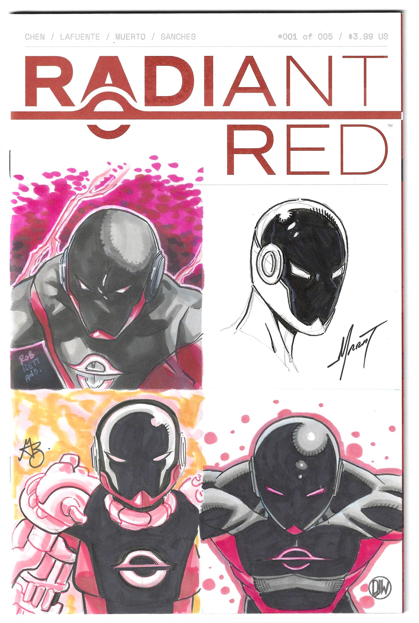 An exceptional 4-artist sketch jam on Radiant Red #1 blank cover! This unique collaboration features original artwork by Rob Retiano, Marat Mychaels, Greg Kirkpatrick, and DJ Wiedrich, showcasing four different interpretations of the mysterious Radiant Red character.
