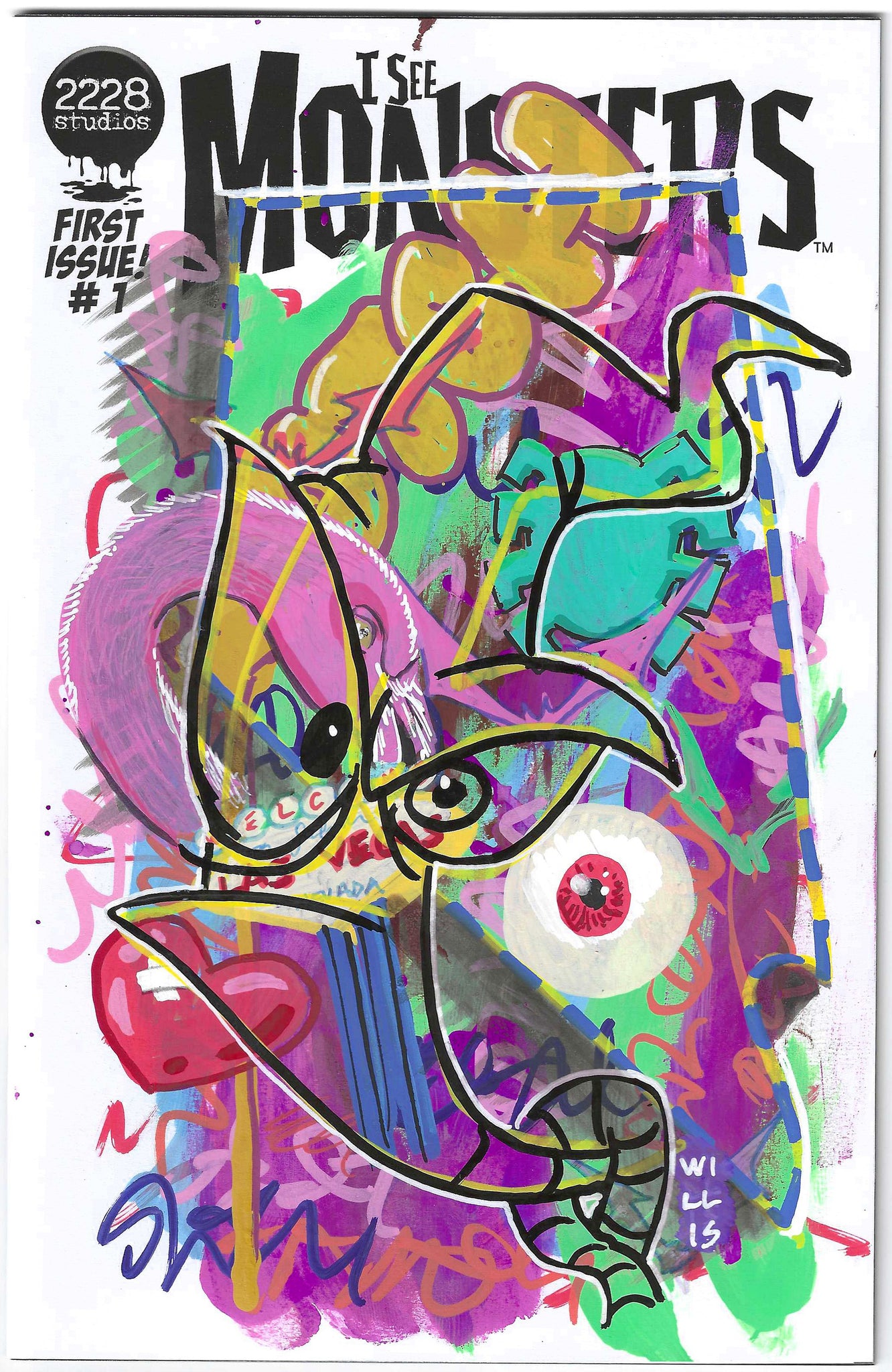 An explosive original artwork by Kyle Willis (professional comic artist and owner of Cowabunga Comics) on the official I See Monsters #1 Squadd blank sketch cover!